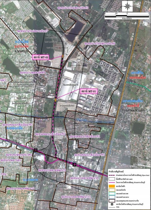 ประกอบด้วยสถานีรับส่งผู้โดยสาร 2 สถานี ได้แก่ สถานี MT-01 ตั้งอยู่บริเวณอิมแพ็คชาเลนเจอร์ (Impact Challenger) และสถานี MT-02 ตั้งอยู่บริเวณด้านหน้าของทะเลสาบเมืองทองธานี รวมระยะทางประมาณ 3 กิโลเมตร มีขอบเขตพื้นที่ศึกษาอยู่ห่างจากศูนย์กลางแนวเส้นทางข้างละ 500 เมตร ครอบคลุมพื้นที่ 3 ตำบล ได้แก่ ตำบลบางตลาด ตำบลคลองเกลือ และตำบลบ้านใหม่ ในพื้นที่การปกครองของเทศบาลนครปากเกร็ด อำเภอปากเกร็ด จังหวัดนนทบุรี