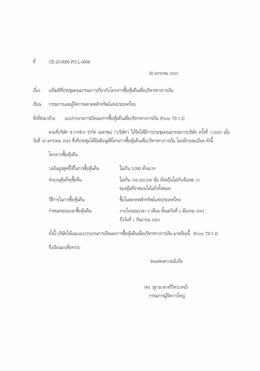 ผู้สื่อข่าว “ประชาชาติธุรกิจ” รายงานว่า บมจ.ช.การช่าง (CK) และบมจ.ธนาคารกสิกรไทย (KBANK) แจ้งต่อตลาดหลักทรัพย์แห่งประเทศไทย (ตลท.) ถึงมติการประชุมคณะกรรมการ (บอร์ด) วันนี้ (30 ม.ค.63) เรื่องโครงการซื้อหุ้นคืนเพื่อบริหารทางการเงิน